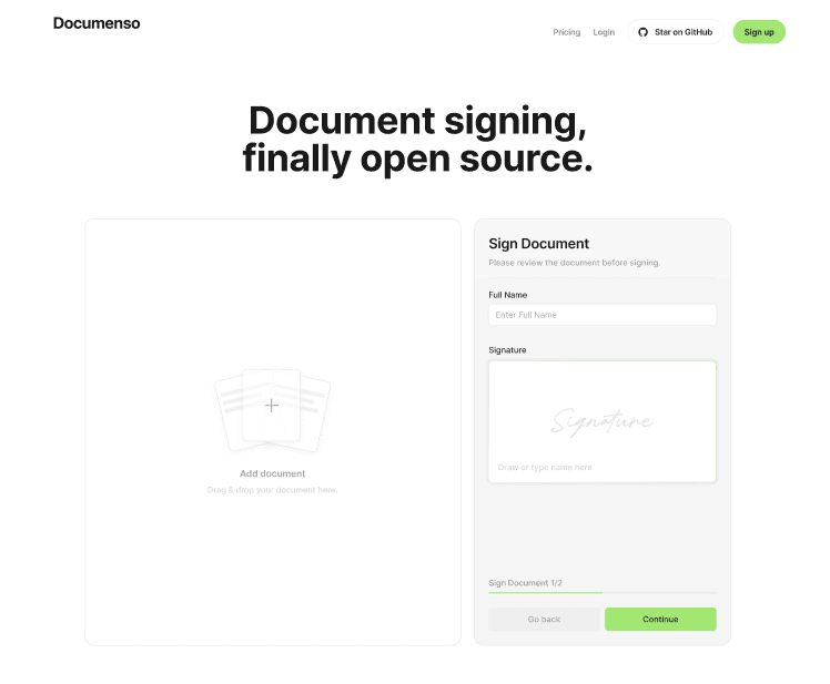 Single Player Mode will be a free, loginless signing experience for single signers. If you hate creating an account to sign a single, once-in-a-while-document yourself as much as we do, we've got you. Our new free tier will accompany Singleplayer. While you don't HAVE to create an account to sign sth. quickly, you can. A free tier Documenso Account will give you the following: